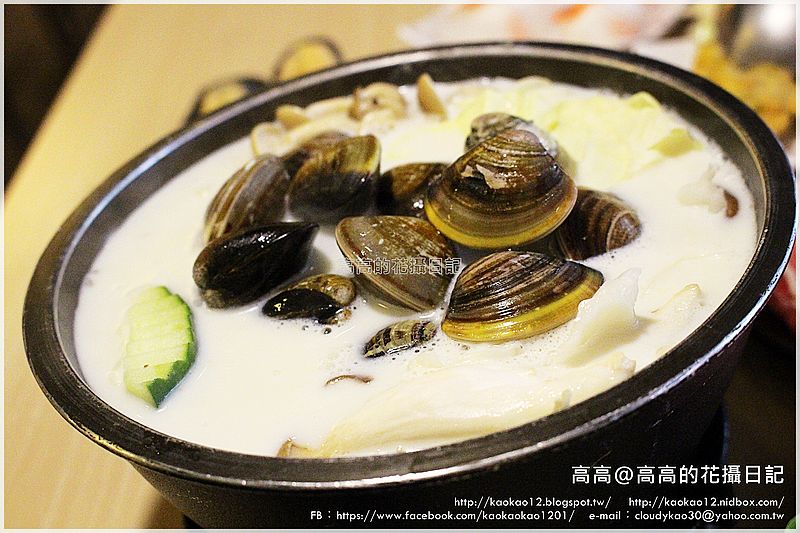 海鮮鍋內有魚片、白蝦、蛤蜊、淡菜,海鮮種類滿豐富。